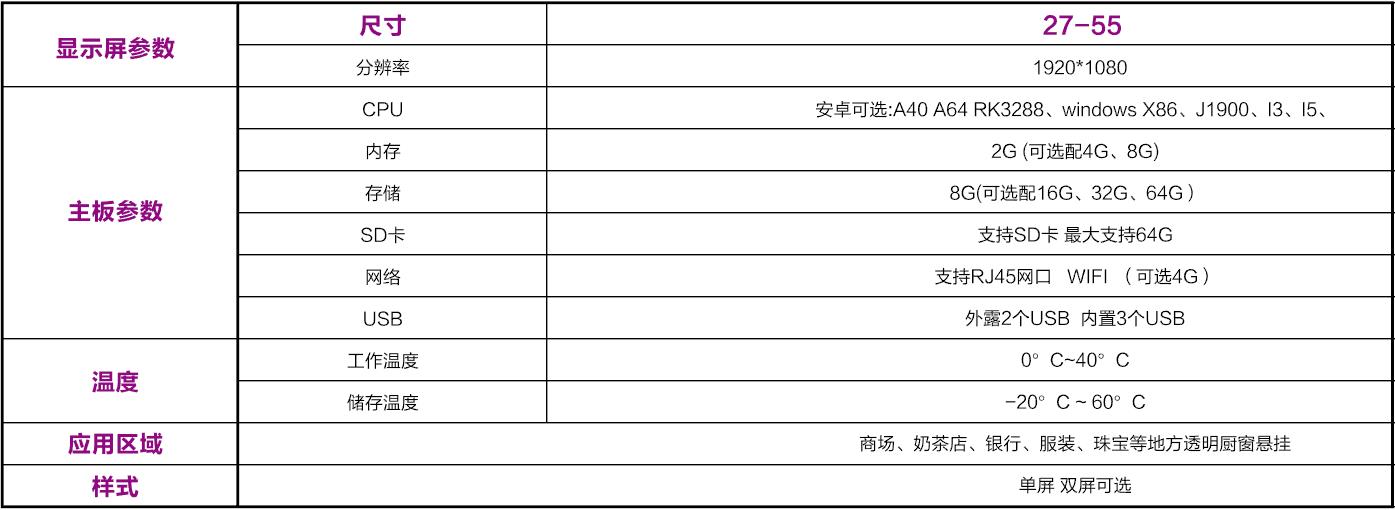 超薄機身;超窄邊框;外觀(guān)精美;雙面設計;任意分屏顯示;多窗口視頻圖片播放;高清畫(huà)質(zhì);散熱快、流暢運行;是商業(yè)宣傳的不二之選。